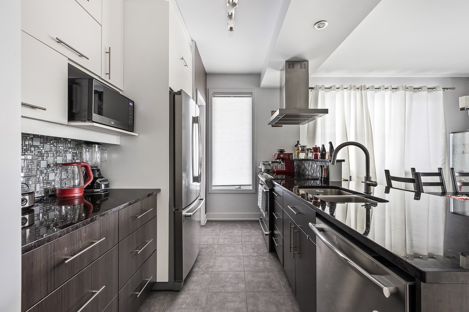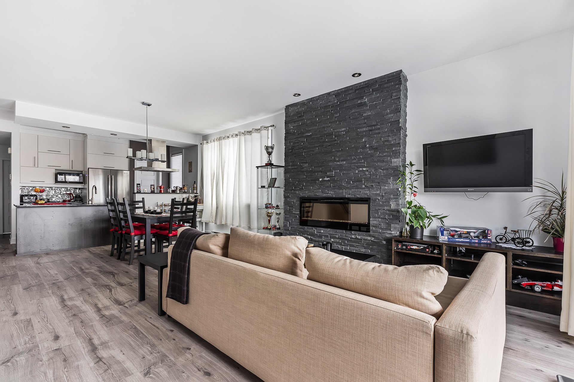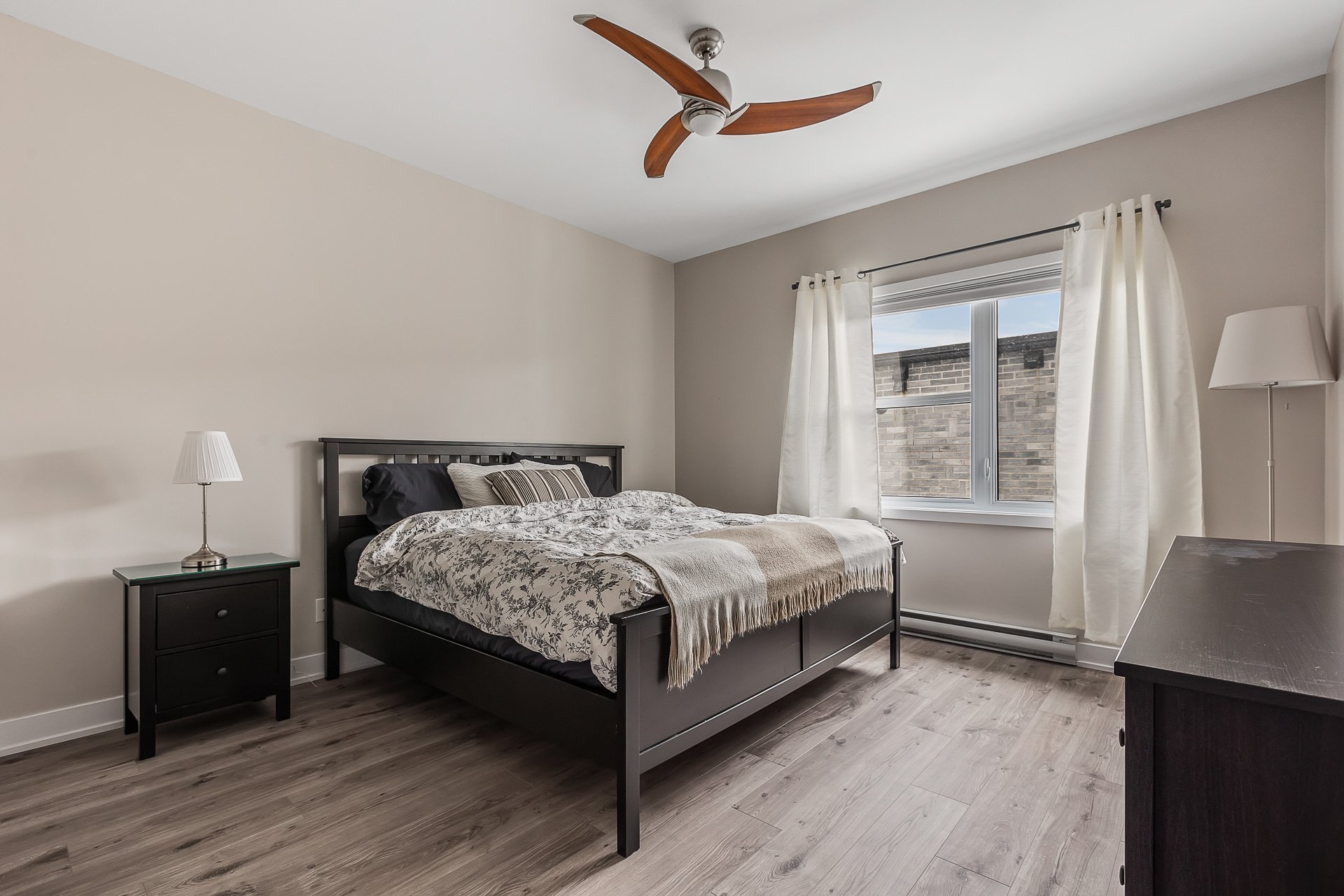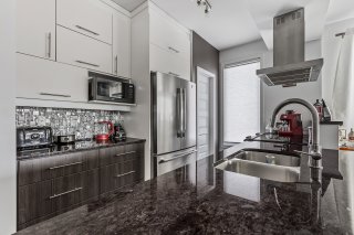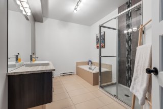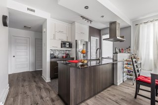 Inclus : chambre des maîtres (lit, table de chevet, meuble de rangement pour vêtements, rideaux, stores, miroir du walk-in), 2e chambre (bibliothèques, bureau, tableau transparent au mur, stores), salon (sofa-lit, table basse, meuble télé, télévision avec Apple TV, rideaux), salle à manger (table extensible avec 6 chaises, rideaux), salle de bain (support en bois pour serviettes), électroménagers (laveuse, sécheuse, appareil air climatisé, foyer électrique, réfrigérateur, lave-vaisselle, four, hotte)