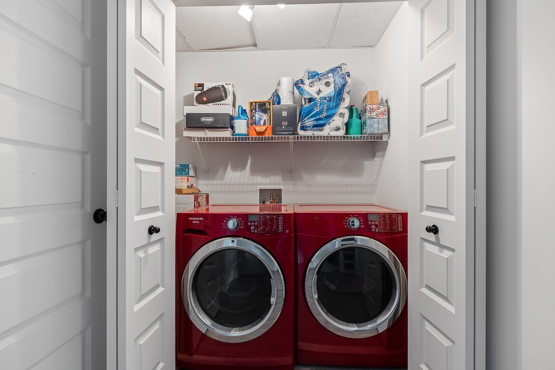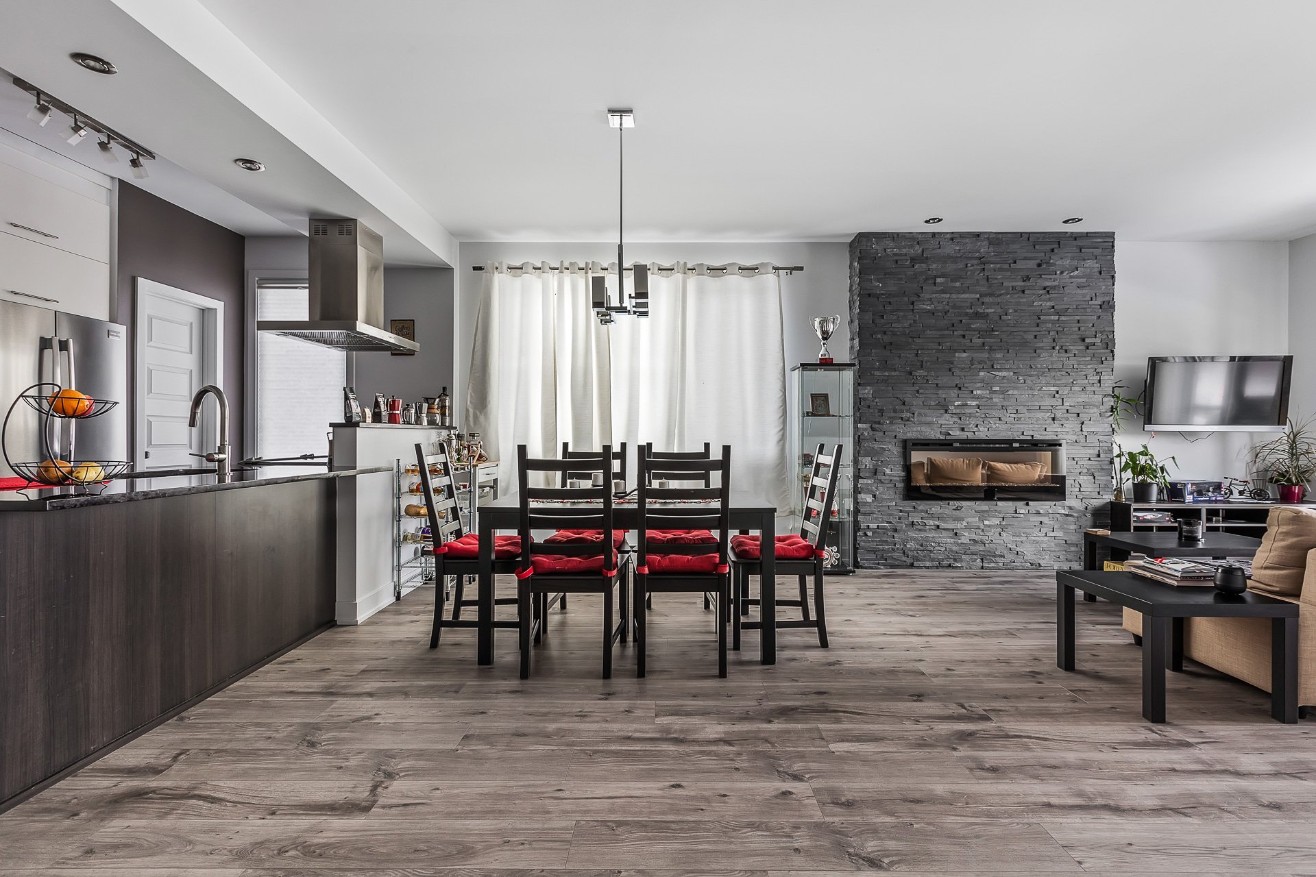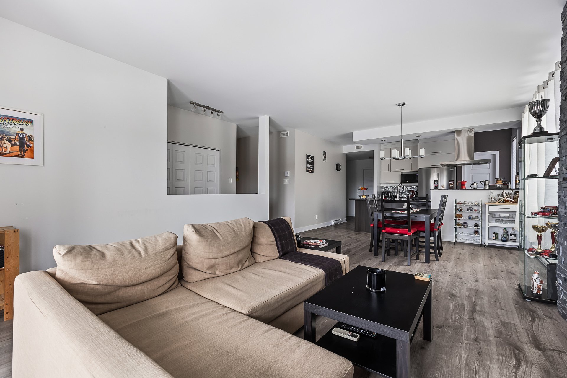 Inclus : chambre des maîtres (lit, table de chevet, meuble de rangement pour vêtements, rideaux, stores, miroir du walk-in), 2e chambre (bibliothèques, bureau, tableau transparent au mur, stores), salon (sofa-lit, table basse, meuble télé, télévision avec Apple TV, rideaux), salle à manger (table extensible avec 6 chaises, rideaux), salle de bain (support en bois pour serviettes), électroménagers (laveuse, sécheuse, appareil air climatisé, foyer électrique, réfrigérateur, lave-vaisselle, four, hotte)